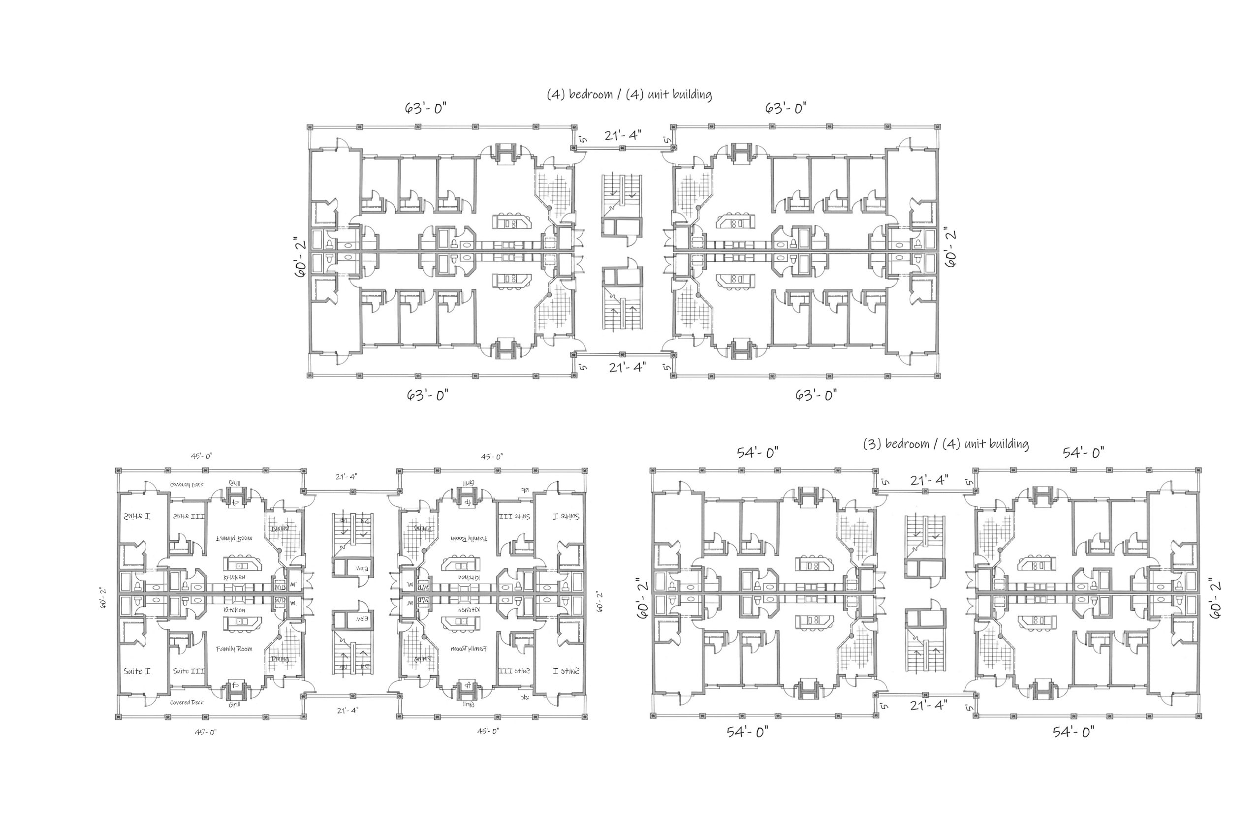 Build as individual starter home, single level duplex, quadra-plex, or stack them two, three, and even four levels high. The units can be placed, end to end and, or back-to-back, reducing the amount of footing and exterior wall. This will give you up to sixteen units per building if desired. The stairwell can be covered or enclosed, or revised as a carport or garage for single levels